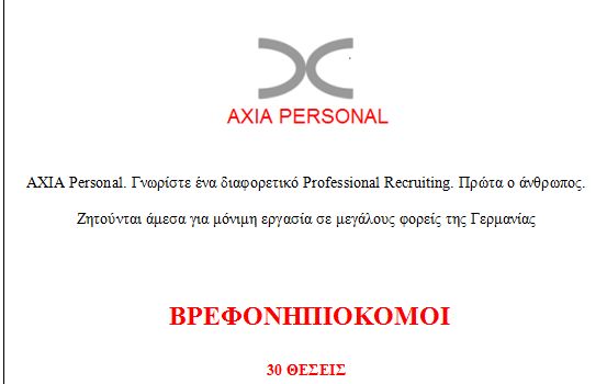 20.11.2012 - 12:40 30 θέσεις εργασίας για βρεφονηπιοκόμους στην Γερμανία ΕΡΓΑΣΙΑ 30 θέσεις εργασίας για βρεφονηπιοκόμους στην Γερμανία