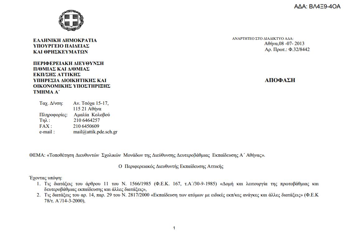 09.07.2013 - 17:09 Τοποθέτηση Διευθυντών Σχολικών Μονάδων της Διεύθυνσης Δευτεροβάθμιας Εκπαίδευσης Α' Αθήνας ΕΚΠΑΙΔΕΥΣΗ Τοποθέτηση Διευθυντών Σχολικών Μονάδων της Διεύθυνσης Δευτεροβάθμιας Εκπαίδευσης Α' Αθήνας