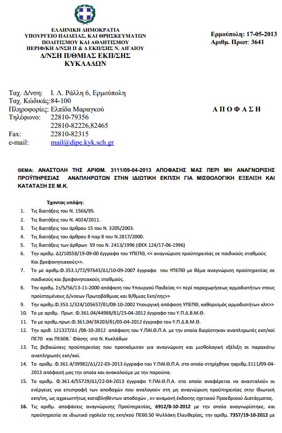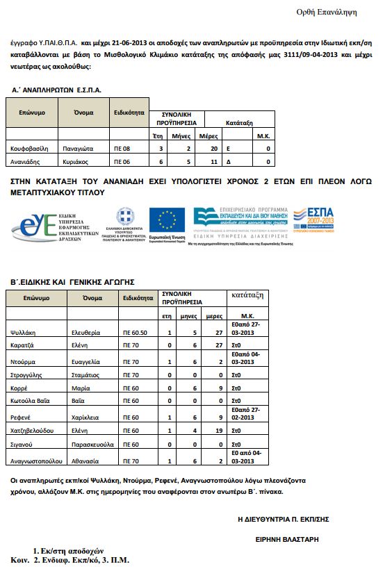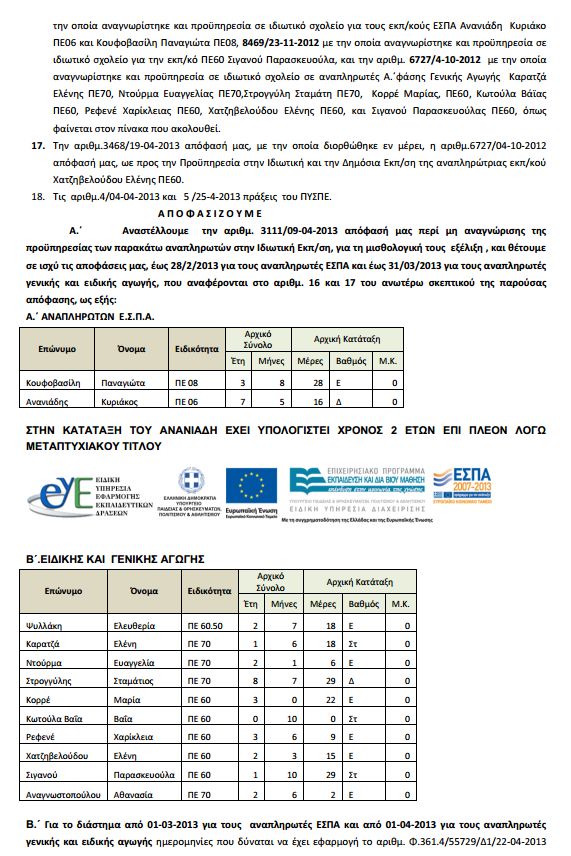 Αναστολή απόφασης περί μη αναγνώρισης προϋπηρεσίας αναπληρωτών στην ιδιωτική εκπ/ση για μισθολογική εξέλιξη και κατάταξη σε ΜΚ