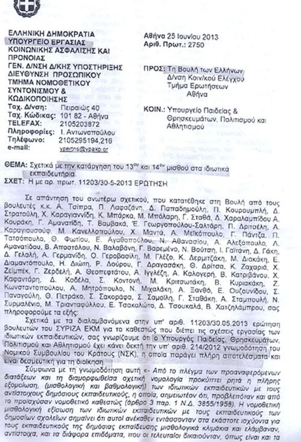 Ο Υπουργός Εργασίας απαντάει για το ζήτημα της κατάργησης του 13ου και του 14ου μισθού που αποφάσισε μονομερώς η διοίκηση του Κολλεγίου Αθηνών και άλλοι ιδιοκτήτες ιδιωτικών σχολείων σε ερώτηση που του τέθηκε στην Βουλή από την Κ.Ο. του ΣΥΡΙΖΑ με επικεφαλή τον Αλέξη Τσίπρα.