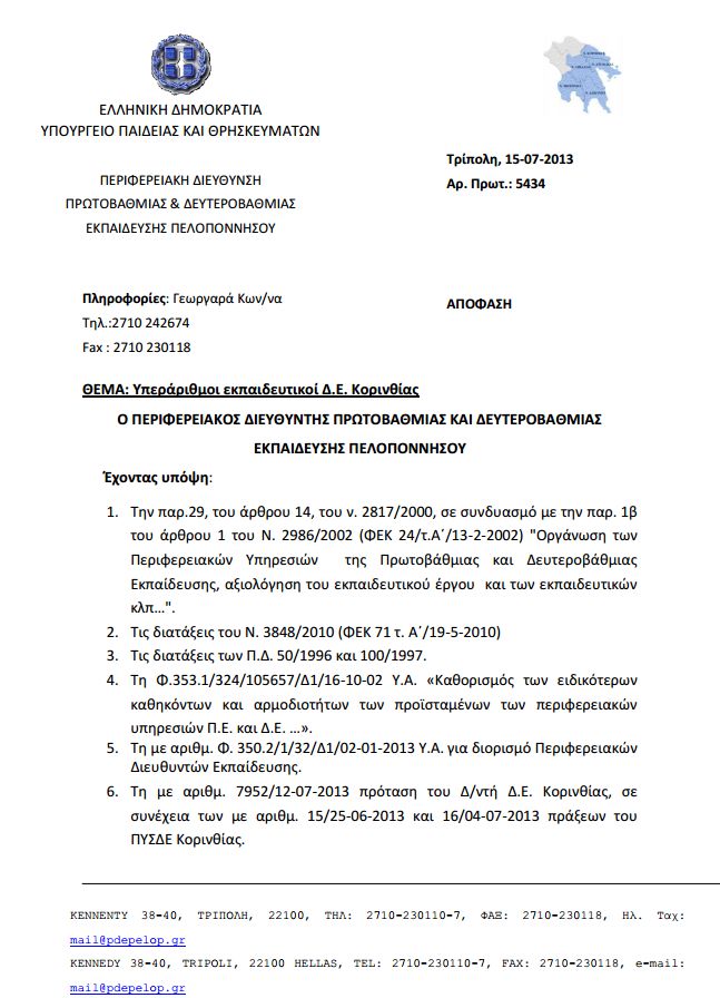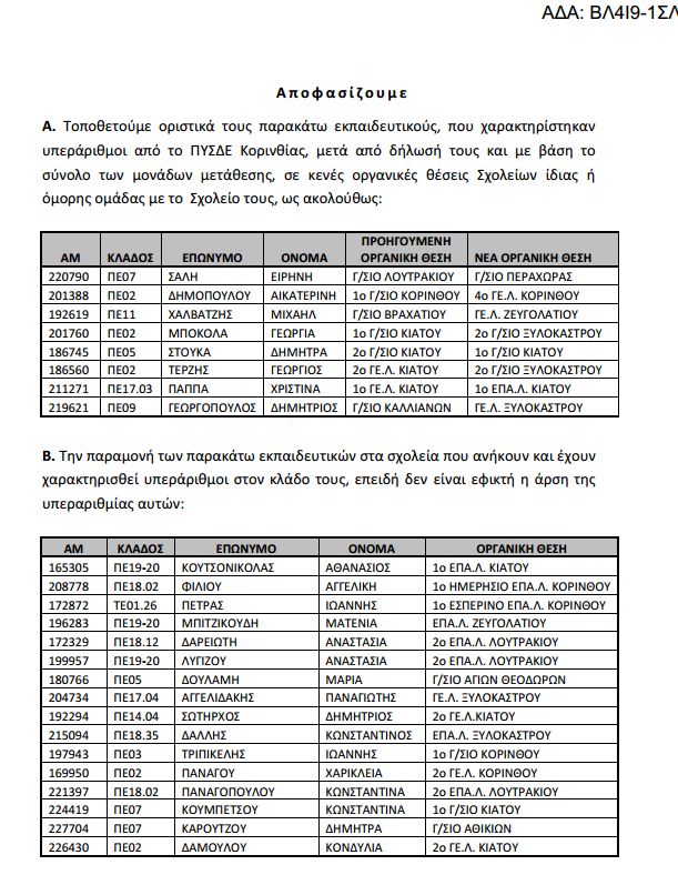 Υπεράριθμοι εκπαιδευτικοί ΔΕ Κορινθίας