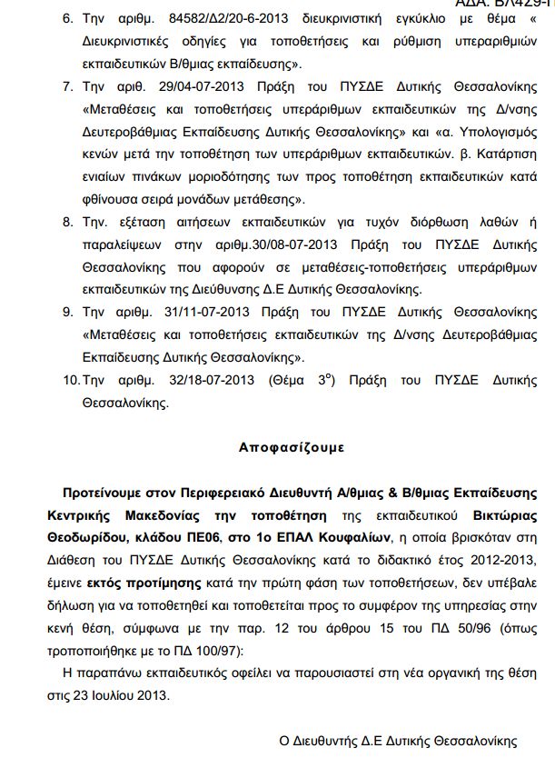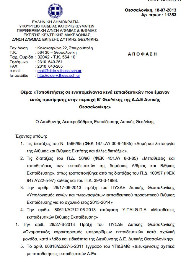 Τοποθετήσεις σε εναπομείναντα κενά εκπαιδευτικών που έμειναν εκτός προτίμησης στην περιοχή  Β Θεσσαλονίκης της Δ.Δ.Ε Δυτ. Θεσσαλονίκης