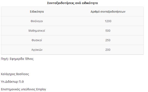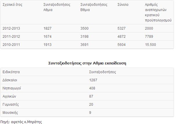 Οι περισσότερες αποχωρήσεις εκπαιδευτικών αφορούν τις ειδικότητες των φιλολόγων, μαθηματικών και φυσικών. Αξίζει να σημειωθεί ότι το 2012 συνταξιοδοτήθηκαν συνολικά 4872 εκπαιδευτικοί, 3198 δευτεροβάθμια εκπαίδευση και 1674 στην πρωτοβάθμια, και το Υπουργείο Παιδείας αναγκάστηκε να προχωρήσει σε διορισμό 7789 αναπληρωτών από τον κρατικό προϋπολογισμό (πηγή: Πανελλήνιος Σύλλογος Αναπληρωτών Φιλολόγων).Ο μεγάλος αριθμός των συνταξιοδοτήσεων σε συνδυασμό με το μειωμένο αριθμό αναπληρωτών, μόλις 2000 στο κανονικό πρόγραμμα, αναδεικνύεται σε σταυρόλεξο για δυνατούς λύτες και αναμένεται να δούμε πως θα αντιμετωπίσει το πρόβλημα το Υπουργείο Παιδείας.