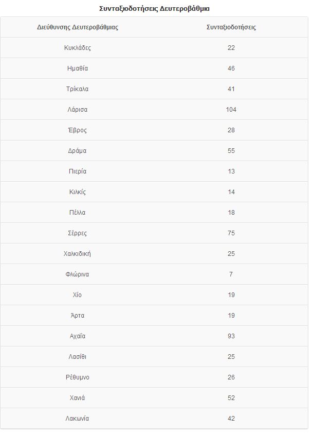 Τη μερίδα του λέοντος την είχαν οι δάσκαλοι καθώς αποχώρησαν 1287 και ακολουθούν οι νηπιαγωγοί καθώς 408 αποφάσισαν να αποχωρήσουν από τα δημόσια σχολεία.Μικρότερος ήταν ο αριθμό των συνταξιοδοτήσεων στις ειδικότητες της πρωτοβάθμιας εκπαίδευσης. Ωστόσο εκτός από την πρωτοβάθμια και στη δευτεροβάθμια υπάρχουν πολλοί εκπαιδευτικοί που αποφάσισαν να βγουν στη σύνταξη. Χαρακτηριστικά αναφέρουμε ότι σύμφωνα με δημοσίευμα της εφημερίδας «Ελευθερία» της Λάρισας μόνο στη Θεσσαλία υπέβαλλαν αίτηση συνταξιοδότησης 208 εκπαιδευτικοί δευτεροβάθμιας εκπαίδευσης. Από αυτούς οι 104 προέρχονταν από το νομό Λαρίσης και 41 από τα Τρίκαλα. Συνολικά υπολογίζεται ότι οι συνταξιοδοτήσεις στη δευτεροβάθμια θα φθάσουν τις 3500.