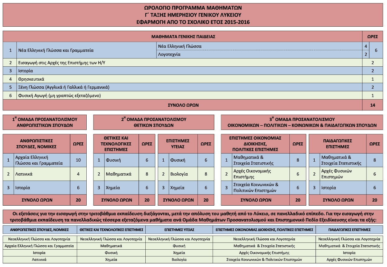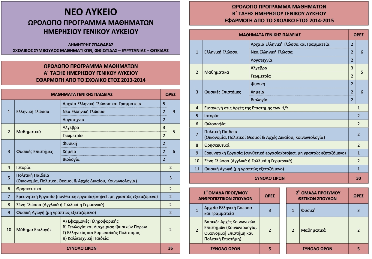 Ψηφίστηκε τελικά ο νόμος 4186 «Αναδιάρθρωση της Δευτεροβάθμιας Εκπαίδευσης και λοιπές διατάξεις» και δημοσιεύτηκε στο Φ.Ε.Κ. 193Α/17-9-2013. Αλλαγές έγιναν και την τελευταία στιγμή. Για παράδειγμα στα Μαθηματικά της Α΄ τάξης Γενικού Λυκείου σύμφωνα την 115478/Γ2/21-08-2013 εγκύκλιο του Υ.ΠΑΙ.Θ. που δημοσιεύτηκε στο Φ.Ε.Κ. 2121/Β/28-8-2013 προβλεπόταν για τη μεν Άλγεβρα 3 ώρες το Α΄ τετράμηνο και 2 ώρες το Β΄ ενώ για τη Γεωμετρία 2 ώρες το Α΄ τετράμηνο και 3 ώρες το Β΄. Αυτό που τελικά ψηφίστηκε και ισχύει από φέτος είναι, 3 ώρες εβδομαδιαίως για την Άλγεβρα και 2 ώρες για τη Γεωμετρία για όλη τη σχολική χρονιά.