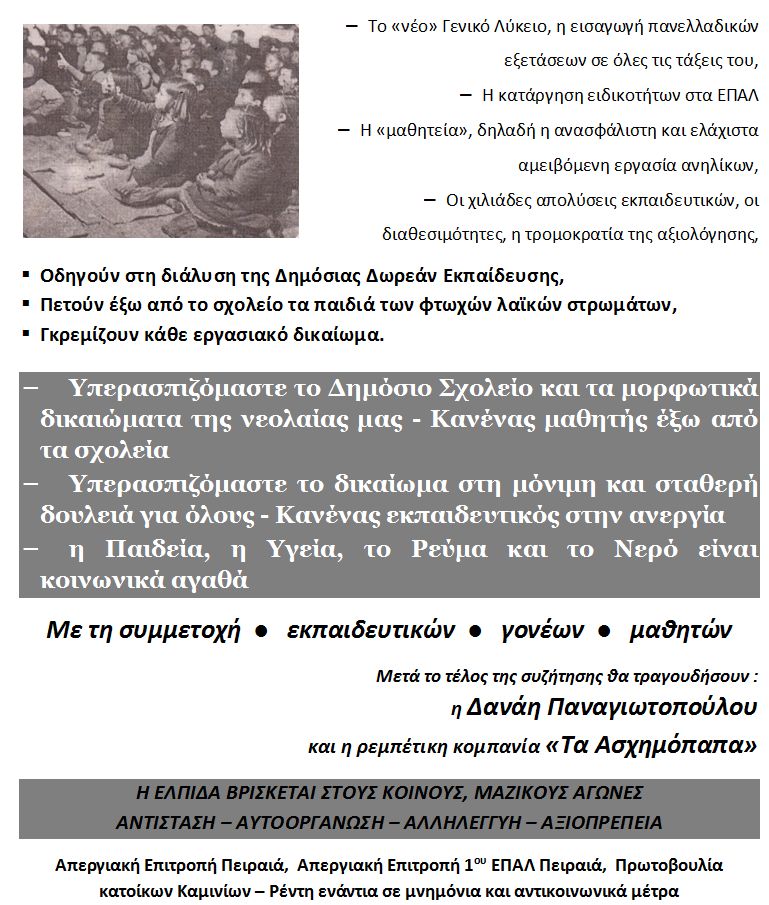 Απεργιακή Επιτροπή Πειραιά,  Απεργιακή Επιτροπή 1ου ΕΠΑΛ Πειραιά,  Πρωτοβουλία κατοίκων Καμινίων – Ρέντη ενάντια σε μνημόνια και αντικοινωνικά μέτρα