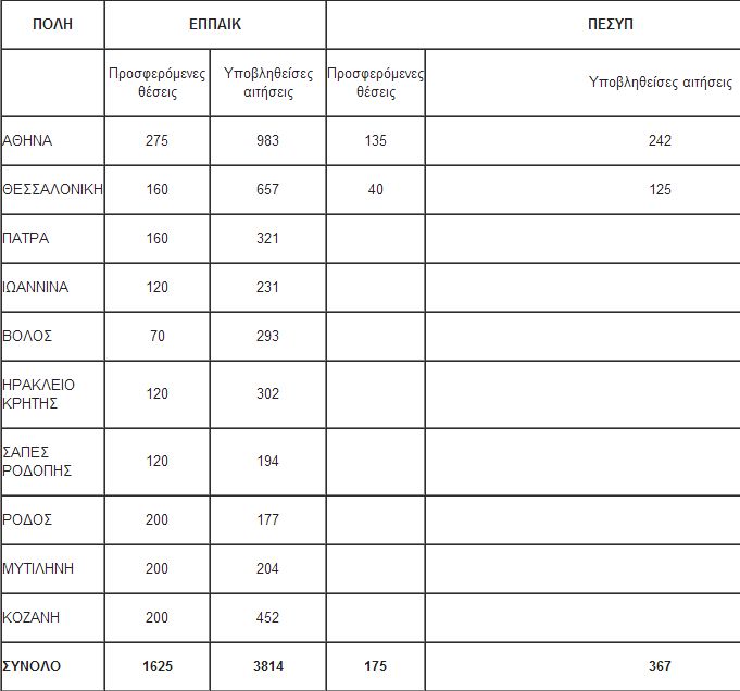 Ο αριθμός των αιτήσεων που υποβλήθηκαν ανά πρόγραμμα (ΕΠΠΑΙΚ, ΠΕΣΥΠ) και πόλη είναι: