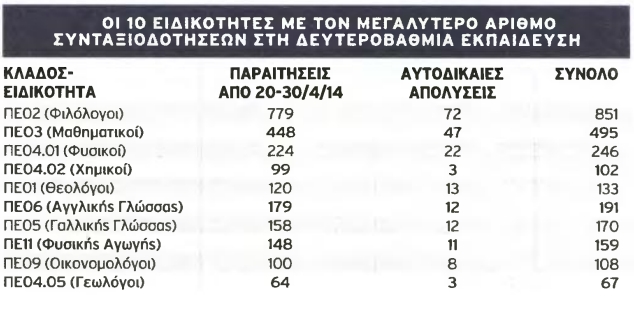 Σύμφωνα με τα αναλυτικά στοιχεία για τις αποχώρησες εκπαιδευτικών από τα σχολεία της πρωτοβάθμιας της δευτεροβάθμιας φαίνεται ότι συνταξιοδοτούνται σχεδόν 6.000, εκ των οποίων οι 5.015 κατέθεσαν αιτήσεις έως 30/6 και οι υπόλοιποι χίλιοι έως τον Μάρτιο του 2014.