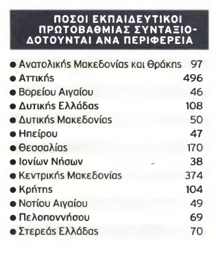 Από τους 1.725 εκπαιδευτικούς που υπηρετούσαν μέχρι φέτος στην πρωτοβάθμια, 1.240 είναι δάσκαλοι, 329 νηπιαγωγοί, 101 Καθηγητές Αγγλικής Γλώσσας, 40 Γυμναστές και 15 διαφόρων ειδικοτήτων. Οι περισσότερες αποχωρήσεις καταγράφονται στην :