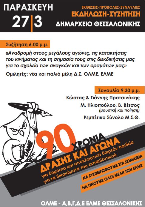 Τα Δ.Σ. της Α΄, Β΄, Γ΄, Δ΄, Ε΄ ΕΛΜΕ, καθώς και το Δ.Σ. της ΟΛΜΕ, για να τιμήσουν τους αγώνες αυτούς, αλλά και τους εκπαιδευτικούς που συνέβαλαν για να λειτουργεί και να δρα η Ομοσπονδία των καθηγητών της δευτεροβάθμιας εκπαίδευσης, οργανώνουν εκδήλωση – συζήτηση, συναυλία, προβολές και εκθέσεις την Παρασκευή 27/3.