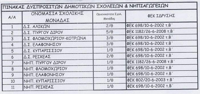 Σας διαβιβάζουμε πίνακα δυσπρόσιτων δημοτικών σχολείων και νηπιαγωγείων του Νομού Λακωνίας προς ενημέρωσή σας.