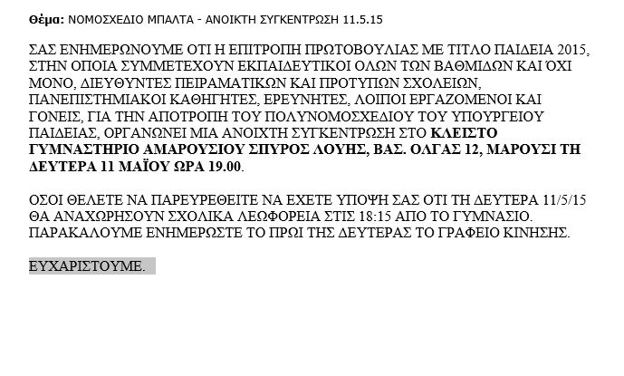 ΥΓ Στη συγκέντρωση που πραγματοποίησε η «κίνηση κατά Μπαλτά» σε κλειστό γυμναστήριο του Αμαρουσίου μισθώθηκαν μέχρι και σχολικά λεωφορεία μεγάλου ιδιωτικού εκπαιδευτηρίου των Αθηνών, θυμίζοντας πρακτικές μεταφερόμενων οπαδών συγκεντρώσεων της δεκαετίας του ’80 (επισυνάπτω το …κάλεσμα του σχολάρχη). Αφιερωμένο σε όσους δεν αναγνωρίζουν τις σκοπιμότητες πίσω από την πολιτικοεπιχειρηματική πρωτοβουλία….