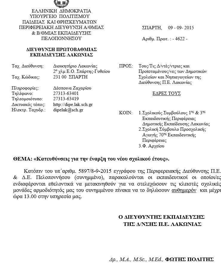 Αυτό είναι το επίσημο διαβιβαστικό του διευθυντή εκπαίδευσης Λακωνίας