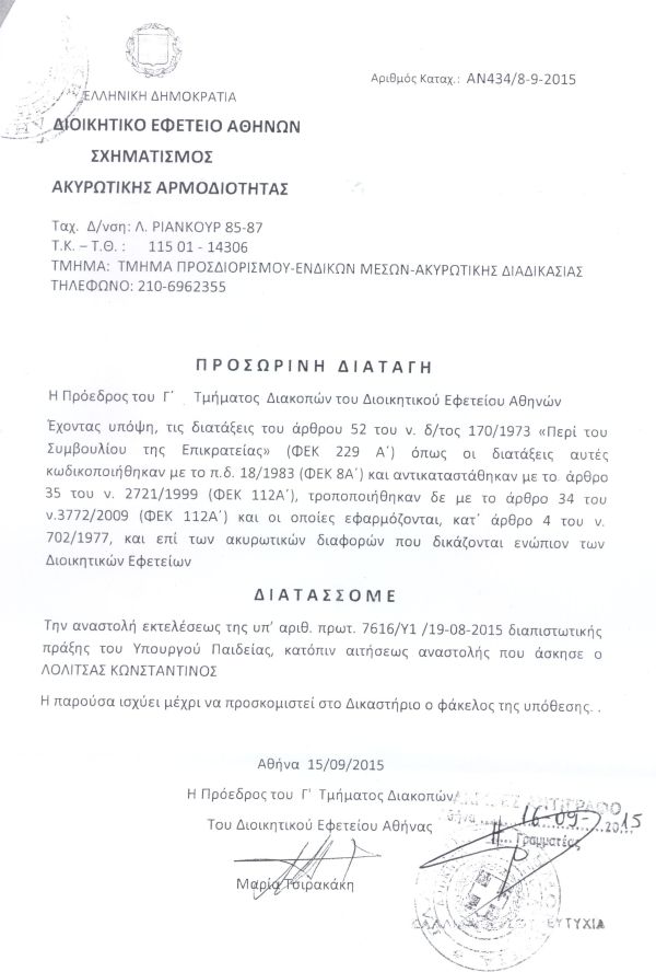 ΜΕ ΠΡΟΣΩΡΙΝΗ ΔΙΑΤΑΓΗ ΤΟ ΔΙΟΙΚΗΤΙΚΟ ΕΦΕΤΕΙΟ ΑΘΗΝΩΝ ΕΠΑΝΑΦΕΡΕΙ ΑΜΕΣΑ ΣΤΗ ΘΕΣΗ ΤΟΥ ΤΟΝ ΔΙΕΥΘΥΝΤΗ ΕΙΔΙΚΗΣ ΑΓΩΓΗΣ ΤΟΥ ΥΠΟΥΡΓΕΙΟΥ ΠΑΙΔΕΙΑΣ ΚΩΝ/ΝΟ ΛΟΛΙΤΣΑ