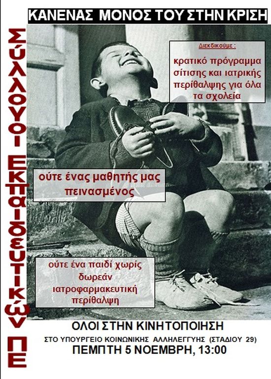 Οι Σύλλογοι Εκπαιδευτικών ΠΕ, Α΄ Αθηνών, Α' Πειραιά "Ρήγας Φεραίος", Αιγάλεω, «Αριστοτέλης», Γλυφάδας-Βάρης-Βούλας-Βουλιαγμένης, «Δ. Γληνός», Καλλιθέας-Μοσχάτου, Κερατσινίου – Περάματος «Νίκος Πλουμπίδης», «Μακρυγιάννης», «Παρθενώνας», Πειραιά «η Πρόοδος», διοργανώνουν κινητοποίηση για το ζήτημα της φτωχοποίησης των μαθητών, στο Υπουργείο Εργασίας και Κοινωνικής Αλληλεγγύης (Σταδίου 29), την Πέμπτη 5 Νοεμβρίου και ώρα 13:00.