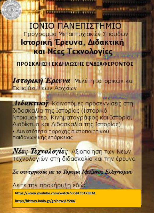 Το Μεταπτυχιακό Πρόγραμμα Σπουδών «Ιστορική έρευνα, Διδακτική και Νέες τεχνολογίες» του Τμήματος Ιστορίας και του Τμήματος Πληροφορικής του Ιονίου Πανεπιστημίου, προκηρύσσει εξετάσεις για να δεχτεί τους φοιτητές του ακαδημαϊκού κύκλου σπουδών 2016 – 2018. Το Πρόγραμμα πρόκειται να δεχθεί έως σαράντα (40) μεταπτυχιακούς φοιτητές. Το Πρόγραμμα έχει διεπιστημονικό προσανατολισμό ,είναι διάρκειας τεσσάρων εξαμήνων και αναπτύσσεται σε δύο άξονες (διδασκαλία και έρευνα). Η συμμετοχή των φοιτητών στο σύνολο της εκπαιδευτικής και ερευνητικής διαδικασίας είναι υποχρεωτική. Τα μαθήματα πραγματοποιούνται στην Κέρκυρα στο κτίριο του Τμήματος Ιστορίας. Τα μαθήματα πραγματοποιούνται και από απόσταση και σε πραγματικό χρόνο για τους φοιτητές που η κατοικία τους βρίσκεται σε μεγάλη απόσταση από την έδρα του ΠΜΣ(εκτός Κέρκυρας). Ιδιαίτερη μέριμνα θα υπάρξει για την διευκόλυνση της παρουσίας των εκπαιδευτικών ώστε να λάβουν εκπαιδευτική ή άλλου είδους άδεια.