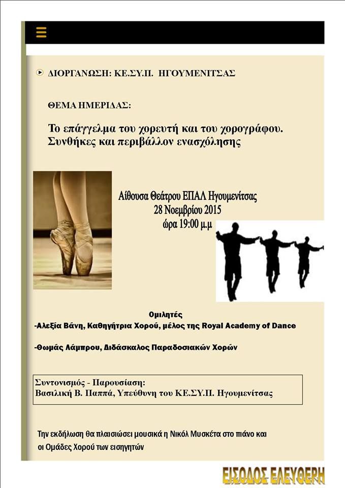 Το ΚΕΣΥΠ Ηγουμενίτσας της Διεύθυνσης Δευτεροβάθμιας Εκπαίδευσης διοργανώνει την Εκπαιδευτική Ημερίδα με θέμα «Το επάγγελμα του χορευτή και του χορογράφου. Συνθήκες και περιβάλλον ενασχόλησης» που θα πραγματοποιηθεί στην αίθουσα Θεάτρου του ΕΠΑΛ Ηγουμενίτσας, στις 28 Νοεμβρίου και ώρα 19:00 μ.μ