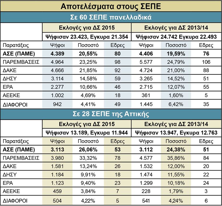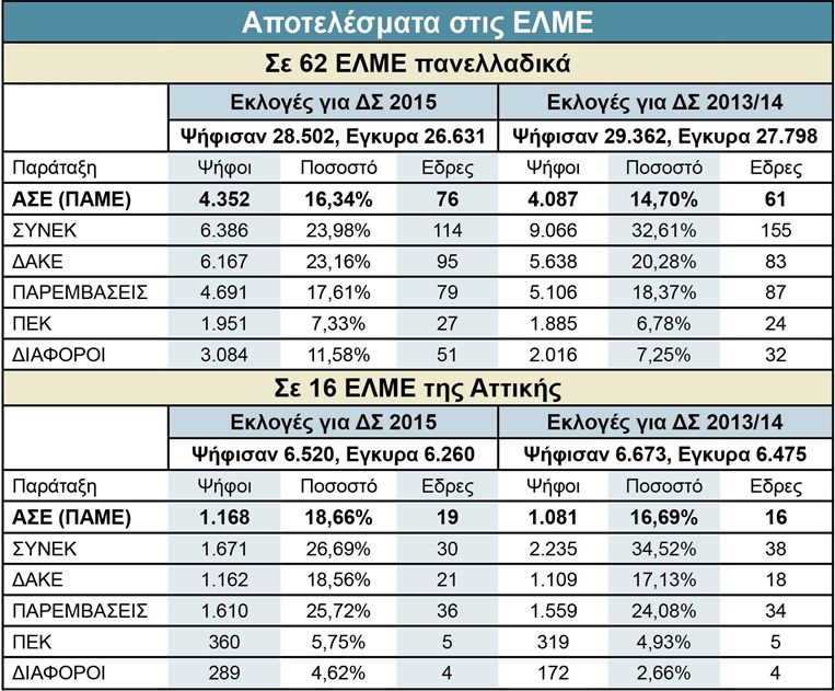 Με αφορμή τις αρχαιρεσίες στις ΕΛΜΕ και τους Συλλόγους Τον Δεκέμβρη του 2015 ολοκληρώθηκαν οι αρχαιρεσίες σε ένα μεγάλο αριθμό Συλλόγων Εκπαιδευτικών Πρωτοβάθμιας Εκπαίδευσης (60 στους 135, οι 28 στην Αττική) και ΕΛΜΕ (62 στις 87, 16 στην Αττική).Το ψηφοδέλτιο της Αγωνιστικής Συσπείρωσης Εκπαιδευτικών που στηρίζουν οι δυνάμεις του ΠΑΜΕ στο χώρο της Εκπαίδευσης σημείωσε άνοδο 1,64% πανελλαδικά στις ΕΛΜΕ (1,96% στην Αττική), σημειώνοντας ποσοστό 16,34% (18,66% Αττική) και 1% πανελλαδικά στους ΣΕΠΕ (1,68% Αττική), σημειώνοντας ποσοστό 20,55% (26,6% Αττική).
