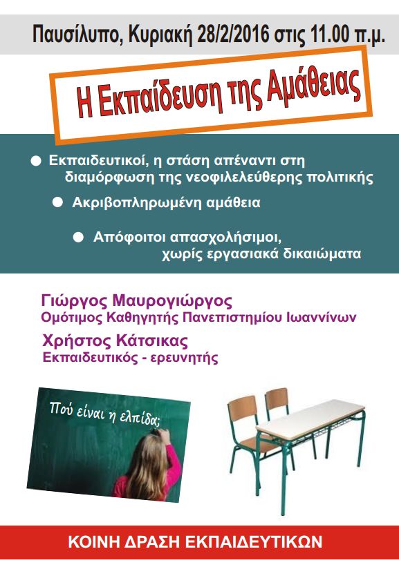 Συζήτηση με το Γιώργο Μαυρογιώργο και το Χρήστο Κάτσικα διοργανώνει η Κοινή Δράση Εκπαιδευτικών στο Παυσίλυπο(Καρδίτσα) την Κυριακή 28 Φεβρουαρίου 11π.μ. με θέμα η «Εκπαίδευση της Αμάθειας»,