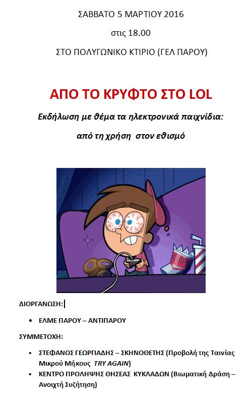Η ΕΛΜΕ Πάρου - Αντιπάρου σας προσκαλεί στις 5 Μαρτίου 2016, ημέρα Σάββατο, στις 6.00μ.μ. στο Πολυγωνικό κτίριο (ΓΕΛ Παροικιάς) σε εκδήλωση με θέμα «Από τη χρήση στην εξάρτηση από τα ηλεκτρονικά παιχνίδια».