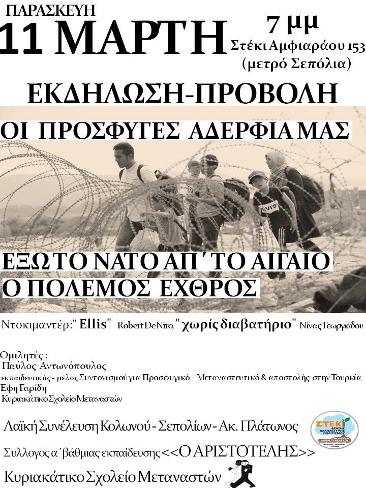 Στη χωρα μας η συνέχιση των μνημονίων και απ’ την κυβέρνηση ΣΥΡΙΖΑ-ΑΝΕΛ, η επιτήρηση και η άγρια λιτότητα, η εντεινόμενη φτώχεια και το ξεπούλημα της Δημοσιας περιουσίας, η φορολόγηση και το νέο ασφαλιστικό, φέρνουν σε απόγνωση λαό και νεολαία. Η κατάσταση χειροτερεύει και με την προσφυγική κρίση που μέρα τη μέρα παίρνει ανεξέλεγκτες διαστάσεις από την συνεχιζόμενη επέμβαση των ΙΜΠΕΡΙΑΛΙΣΤΙΚΩΝ βομβαρδισμών στη ΣΥΡΙΑ.