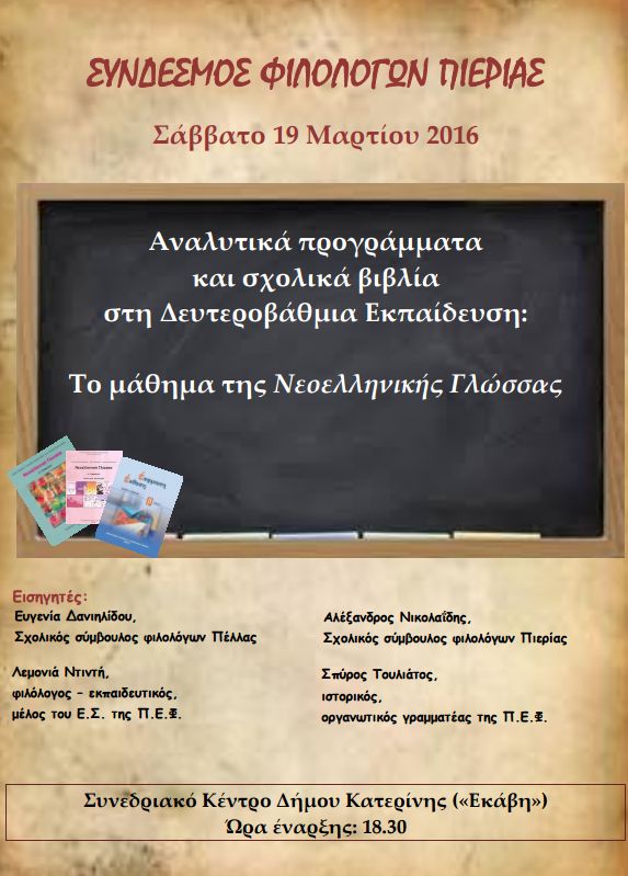 Ο Σύνδεσμος Φιλολόγων Πιερίας σας προσκαλεί, το Σάββατο 19 Μαρτίου 2016, στις 18:30, στο συνεδριακό κέντρο του Δήμου Κατερίνης («Εκάβη») σε ημερίδα με θέμα: « Αναλυτικά προγράμματα και σχολικά βιβλία στη Δευτεροβάθμια Εκπαίδευση.Το μάθημα της Νεοελληνικής Γλώσσας»
