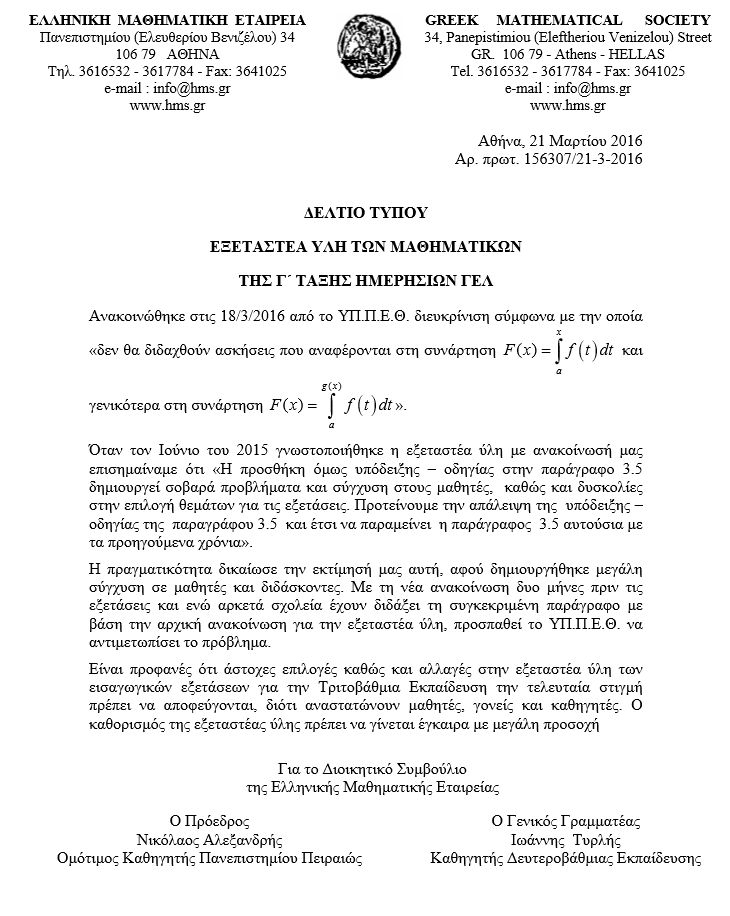Διαβάστε το δελτίο τύπου της Ελληνικής Μαθηματικής Εταιρείας σχετικά με την εξεταστέα ύλη των μαθηματικών της Γ' Τάξης Ημερησίων ΓΕΛ