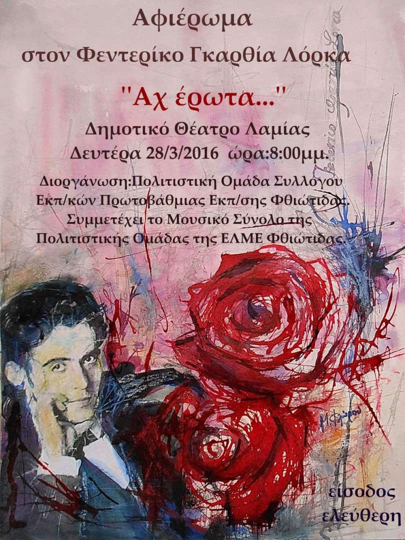 Η Πολιτιστική Ομάδα του Συλλόγου Εκπαιδευτικών Πρωτοβάθμιας Εκπαίδευσης Φθιώτιδας διοργανώνει ένα αφιέρωμα στον Φεντερίκο Γκαρθία Λόρκα, ογδόντα χρόνια μετά τον άδοξο χαμό του.