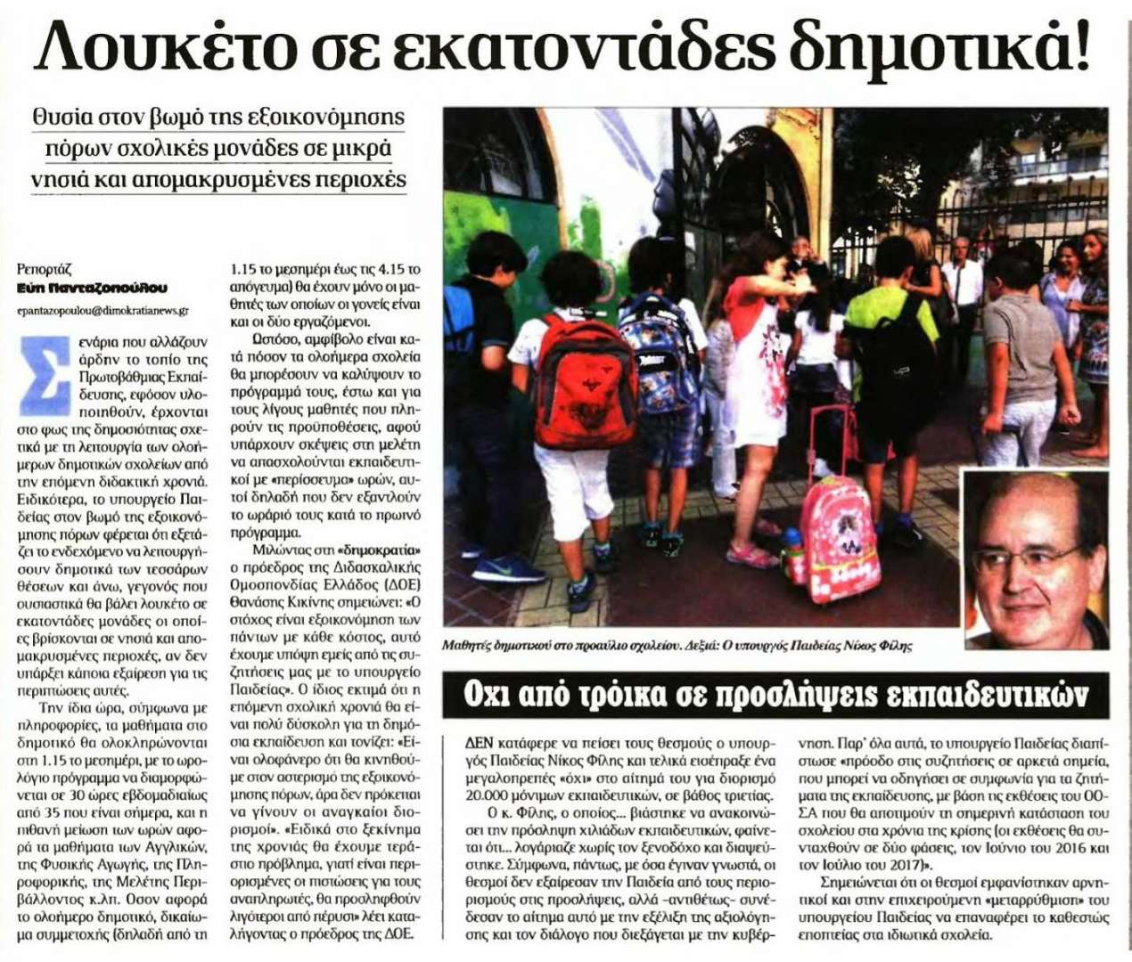 Διαβάστε παρακάτω ολόκληρο το δημοσίευμα της εφημερίδας "ΔΗΜΟΚΡΑΤΙΑ" με τίτλο "Λουκέτο σε εκατοντάδες δημοτικά!"