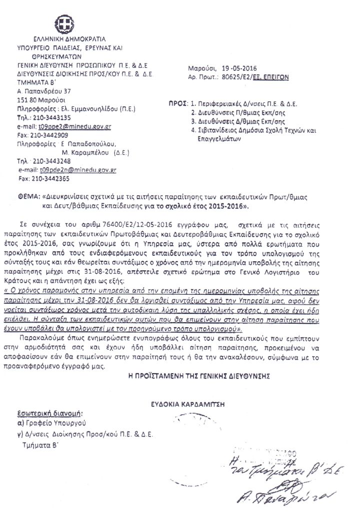 Ο χρόνος παραμονής στην υπηρεσία από την επομένη της ημερομηνίας υποβολής της αίτησης παραίτησης μέχρι την 31-08-2016 δεν θα λογισθεί συντάξιμος από την Υπηρεσία μας, αφού δεν νοείται συντάξιμος χρόνος μετά την αυτοδίκαιη λύση της υπαλληλικής σχέσης, η οποία έχει ήδη επέλθει. Η σύνταξη των εκπαιδευτικών αυτών που θα επιμείνουν στην αίτηση παραίτησης που έχουν υποβάλει θα υπολογιστεί με τον προηγούμενο τρόπο υπολογισμού.