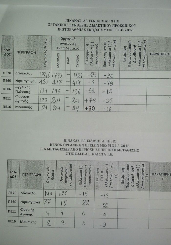 Στην 3η στήλη το έλλειμμα(-) ή το πλέονασμα(+) των οργανικά ανηκόντων σε σχέση με τις οργανικές θέσεις.