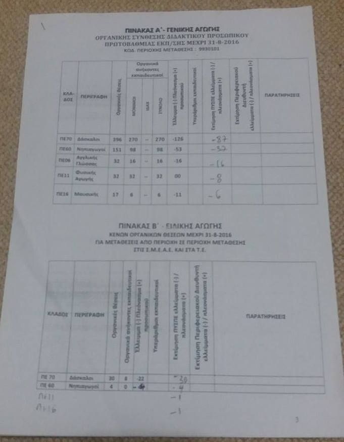 Επισυνάπτω τους δύο πίνακες οργανικής σύνθεσης διδακτικού προσωπικού ΠΕ ειδικής και γενικής αγωγής που προσδιορίστηκαν από όλα τα μέλη του ΠΥΣΠΕ ,πλην εμού , όπου τα οργανικά κενά καθορίστηκαν διαφορετικά από τα λειτουργικά κενά και στο όνομα των «πραγματικών αναγκών» περικόπτονται θέσεις εκπαιδευτικών,μειώνονται μεταθέσεις-αποσπάσεις εκπαιδευτικών.
