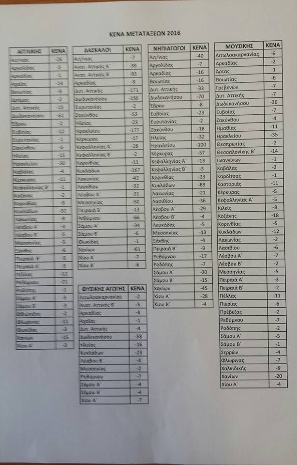 Σας κοινοποιώ πίνακα στον οποίο φαίνονται τα οργανικά κενά, μετά τις μεταθέσεις, με βάση τα οποία θα γίνουν οι μετατάξεις των εκπκών της β/θμιας στην α/θμια, που αποδεσμεύθηκαν από το ΚΥΣΔΕ.