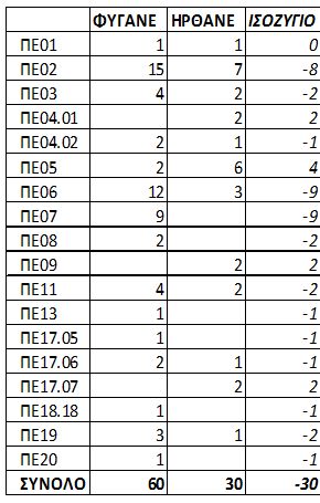 Στην Κορινθία 60 συνάδελφοι-συναδέλφισσες πήρανε απόσπαση για αλλού ενώ ήρθανε εδώ 30. Συγκεκριμένα, ανά ειδικότητα οι 90 συναδέλφισσες-συνάδελφοι είναι: