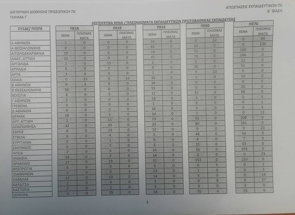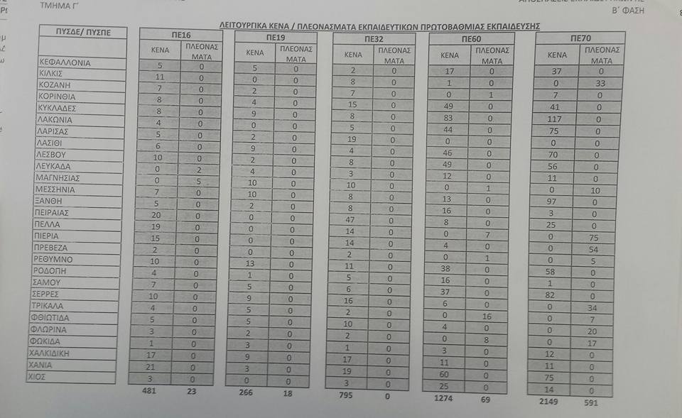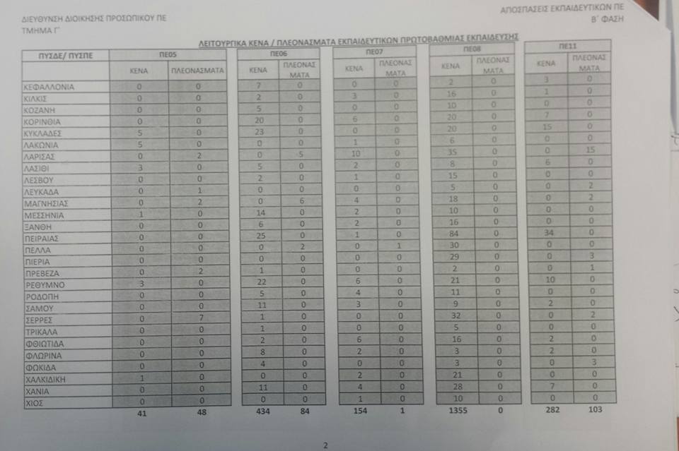 Τα κενά και τα πλεονάσματα όλων των ειδικοτήτων γενικής αγωγής για τη β' φάση των αποσπάσεων από ΠΥΣΠΕ σε ΠΥΣΠΕ