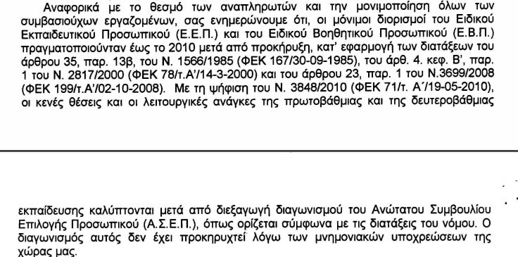 Αναφορικά με το θεσμό των αναπληρωτών και την μονιμοποίηση όλων των συμβασιούχων εργαζομένων, σας ενημερώνουμε ότι, οι μόνιμοι διορισμοί του Ειδικού Εκπαιδευτικού Προσωπικού (Ε.Ε.Π.) και του Ειδικού Βοηθητικού Προσωπικού (Ε.Β.Π.) πραγματοποιούνταν έως το 2010 μετά από προκήρυξη.