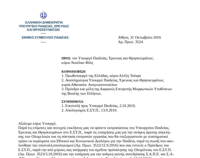 Η επιστολή των εκπροσώπων στο ΕΣΥΠ (του προέδρου του ΕΣΥΠ Ν. Θεοτοκά και των προέδρων του ΣΠΔΕ Δημήτρη Χασάπης, του ΔΑΠΕ Βασίλη Καρδάση και του ΣΑΤΕ Δημοσθένη Σταμάτη) προς τον υπουργό Ν. Φίλη