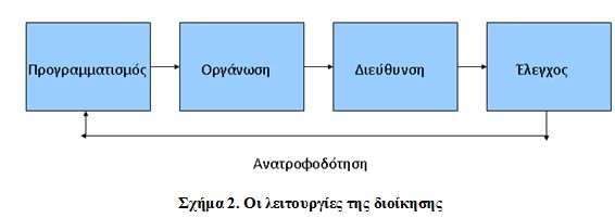 Στο σημείο αυτό είναι καταλυτικής σημασίας ο ρόλος του Διευθυντή, ο οποίος εκτός από τα ηγετικά του χαρακτηριστικά οφείλει να λειτουργήσει και ως manager και να εφαρμόσει τις λειτουργίες του σχεδιασμού/προγραμματισμού (planning), της οργάνωσης (organizing), της διεύθυνσης/καθοδήγησης (leading) και του ελέγχου (controlling), όπως φαίνεται στο ακόλουθο σχήμα 2 (Καραμήτρη, 2012), αλλά και την παραγωγή ικανοποιητικού αποτελέσματος μέσω της διαδικασίας της εκχώρησης αρμοδιοτήτων σε άλλα άτομα (Montana & Charnov, 2000).