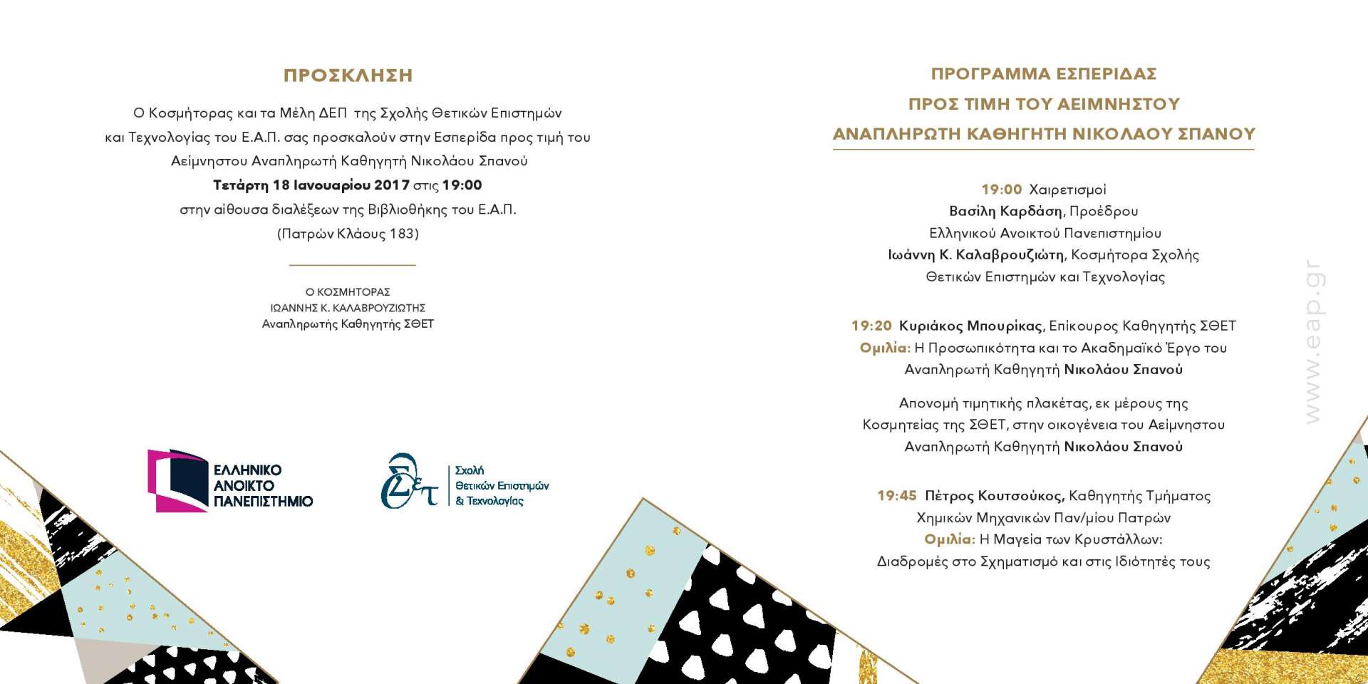 Ο Κοσμήτορας και τα Μέλη ΔΕΠ της Σχολής Θετικών Επιστημών & Τεχνολογίας, σας προσκαλούν στην Εσπερίδα προς τιμή του Αείμνηστου Αναπληρωτή Καθηγητή Νίκου Σπανού.