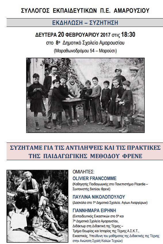 Το Δ. Σ. του Συλλόγου Εκπαιδευτικών Π. Ε. Αμαρουσίου σας προσκαλεί στην εκδήλωση που διοργανώνει, με θέμα: « Συζητάμε για τις αντιλήψεις και τις πρακτικές της Παιδαγωγικής μεθόδου Freinet», τη ΔΕΥΤΕΡΑ 20 ΦΕΒΡΟΥΑΡΙΟΥ 2017 στις 18:30 στο 8 ο Δημοτικό Σχολείο Αμαρουσίου (Μαραθωνοδρόμου 54, Μαρούσι)
