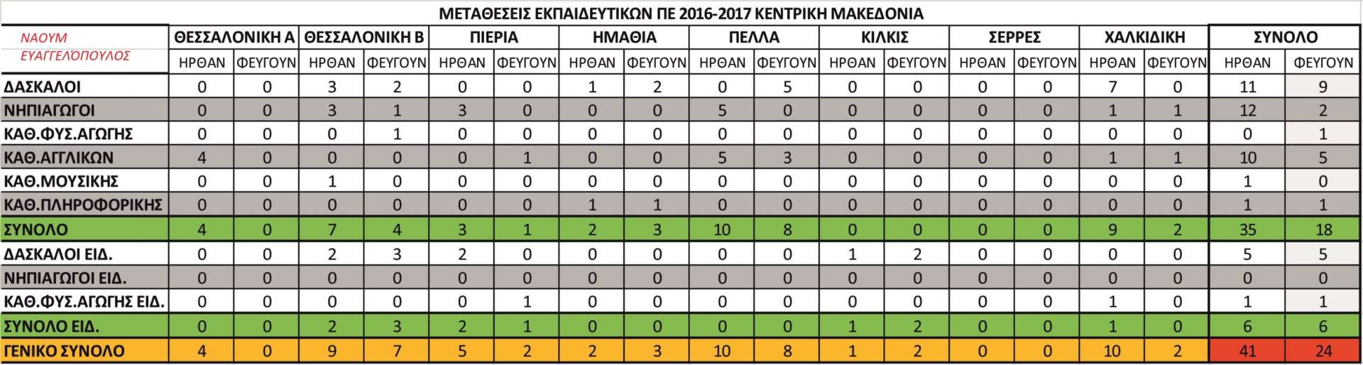 Στο τέλος υπάρχει αναλυτικός πίνακας ανά ειδικότητα και περιοχή με τον αριθμό των εκπαιδευτικών που πήραν μετάθεση και έφυγαν και με τον αριθμό των εκπαιδευτικών που ήρθαν.