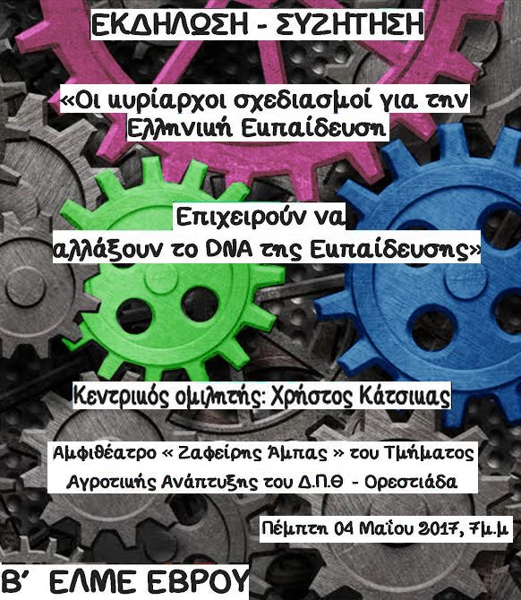 Την Πέμπτη 04 Μαΐου 2017 και ώρα 19.00 η Β΄ ΕΛΜΕ Έβρου θα πραγματοποιήσει στην Ορεστιάδα εκδήλωση με τίτλο: