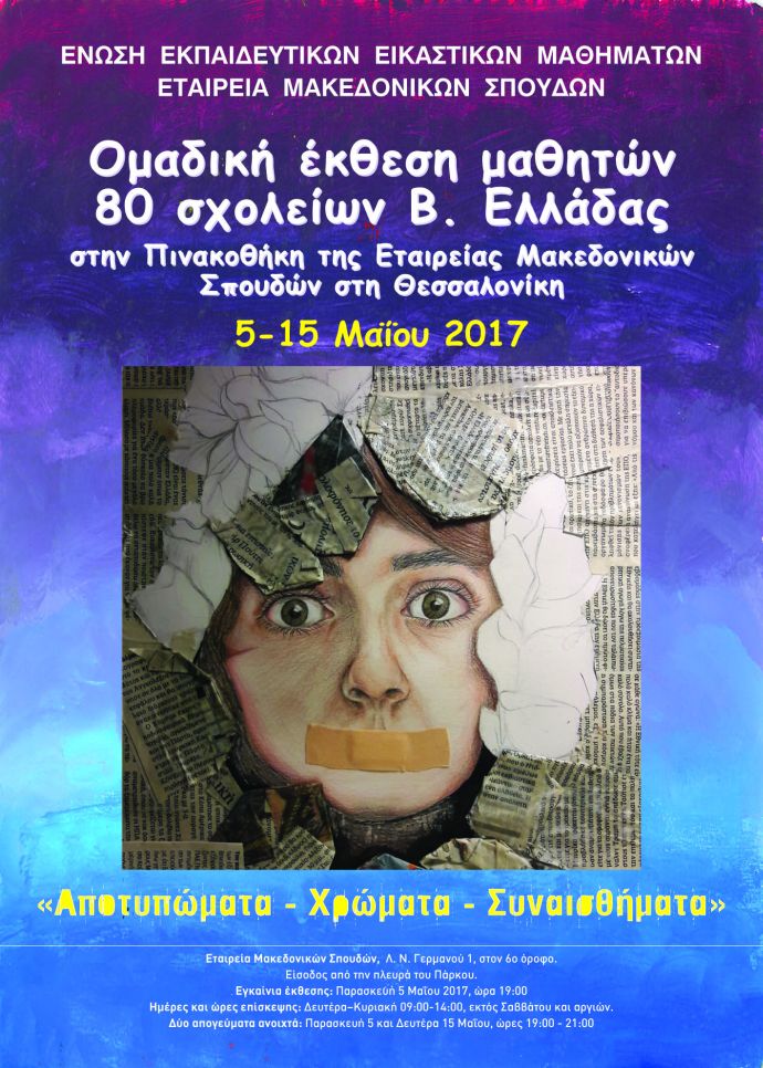 Η Ένωση Εκπαιδευτικών Εικαστικών Μαθημάτων, διοργανώνει ομαδική έκθεση μαθητών Β. Ελλάδας στην Εταιρεία Μακεδονικών Σπουδών στη Θεσσαλονίκη, από 5 έως 15 Μαΐου 2017.