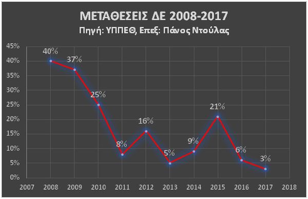 Το χαμηλότερο ποσοστό μεταθέσεων σημειώθηκε φέτος στη Γενική Αγωγή Δευτεροβάθμιας Εκπαίδευσης (εδώ: https://goo.gl/DjVYgO).