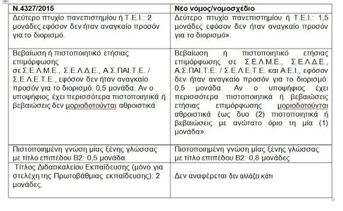 Πίνακας με τις αλλαγές με το προτεινόμενο νομοσχέδιο σε σχέση ,με τον προηγούμενο νόμο επιλογής στελεχών 4327/2015 στην μοριοδότηση των επιπλέον πτυχίων των υποψήφιων διευθυντών