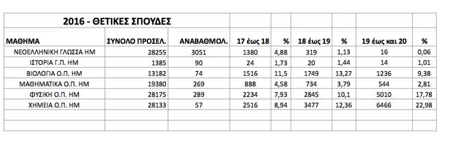 Πίνακας 1: Οι επιδόσεις των υποψηφίων θετικών σπουδών στα εξεταζόμενα μαθήματα