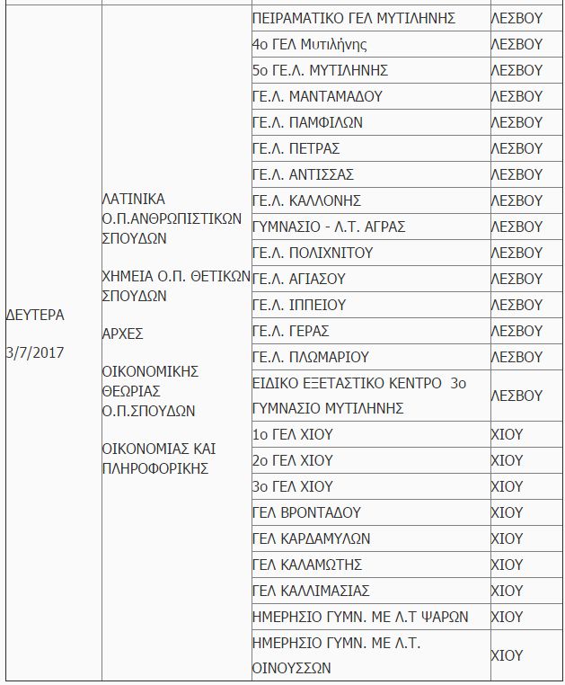 ΠΙΝΑΚΑΣ 2. Διεξαγωγή των πανελλαδικών εξετάσεων ημερήσιων και Εσπερινών ΕΠΑΛ στα παρακάτω Εξεταστικά Κέντρα των νήσων Λέσβου και Χίου ως εξής: