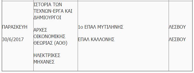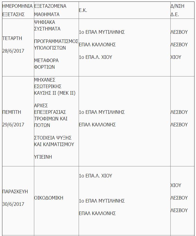 Οι εξετάσεις για τα ΕΠΑΛ θα διεξαχθούν την Τετάρτη 28-6-2017, την Πέμπτη 29-6-2017 και την Παρασκευή 30-6-2017, με ώρα εξέτασης στις 17:00 μμ.
