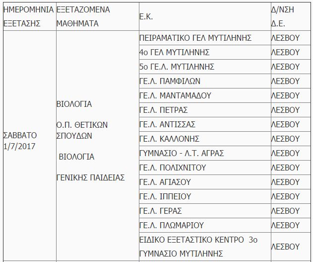 ΠΙΝΑΚΑΣ 1. Διεξαγωγή των πανελλαδικών εξετάσεων ημερήσιων και Εσπερινών ΓΕΛ στα παρακάτω Εξεταστικά Κέντρα των Διευθύνσεων Δ.Ε. Λέσβου και Χίου ως εξής: