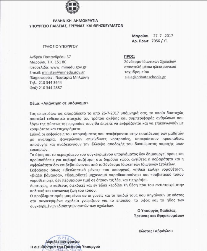 Επιστολή, με την οποία εξηγεί τους λόγους για τους οποίους επιστρέφει ως απαράδεκτο το υπόμνημα της 26ης Ιουλίου 2017, απέστειλε στον Σύνδεσμο Ιδιωτικών Σχολείων (ΣΙΣ). ο Υπουργός Παιδείας έρευνας και Θρησκευμάτων Κώστας Γαβρόγλου.